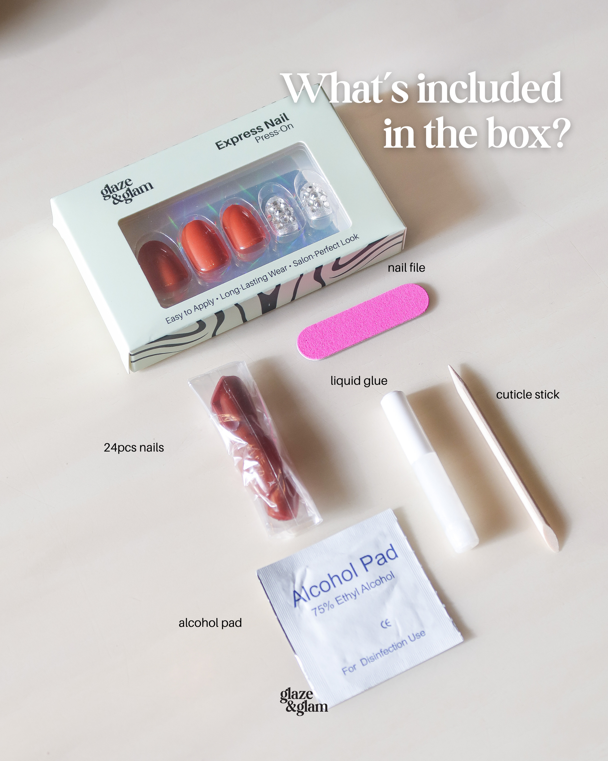 Yes! Every Glaze & Glam order is securely packaged in our custom-designed box to keep your nails safe during delivery. Inside, you’ll find everything you need for a flawless application — a set of press-on nails, nail glue, a nail file, and an alcohol swab — all neatly packed and protected.